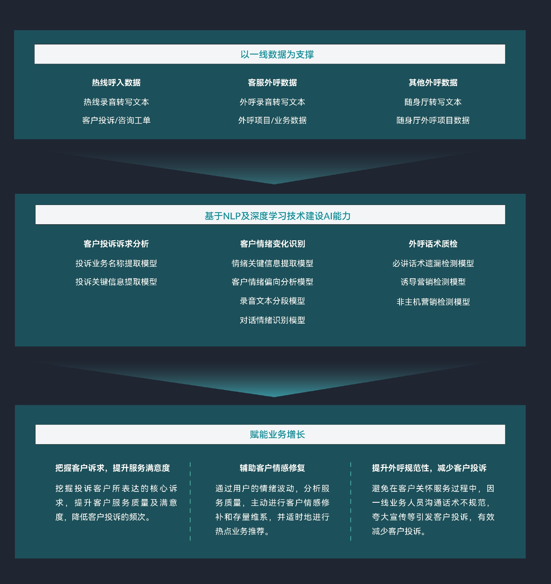应用NLP技术,对客服热线语音、外呼语音、投诉工单等海量业务数据进行处理,分析客户投诉诉求,识别客户情绪变化,并 对外呼话术进行质检,将结果传递给前端业务系统,为改善客户感知、更好地开展营销活动提供了综合支持。